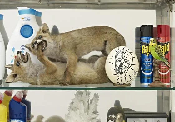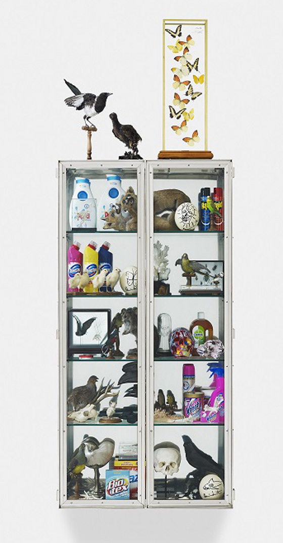 A new sculpture and a corresponding group of works by Damien Hirst in collaboration with Deyrolle, Paris’s legendary house of taxidermy and natural sciences is on the auction site, Paddle 8. Hirst has a fascination with natural history, from halved cows and suspended sharks to diamond encrusted skulls, he plays with the relationships between nature and science, myth and reality, art and beauty, life and death. Using artifice, consumerism, uncertainty, violence, beauty this work “Signification” is a Wunderkammer, “a cabinet of curiosities” that follows an historical tradition dating back to the sixteenth century when Wunderkammer were conceived as visual encyclopedias. Since the late 80s, Hirst has continuously employed cabinets, tanks and vitrines as a means of framing his works. Hirst has added brightly colored cleaning products to the collection, with Pop-art lettering as a symbol of contemporary society’s utopian aspirations. He explains: