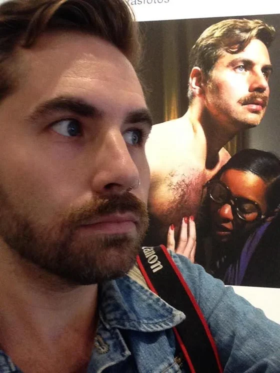 My friend Sean Fader is a conceptual artist and photographer. We met in 2009 at the casting call for Bravo’s reality series Work of Art and have remained friends ever since. I wrote about his project “Sup?” here, where he photographed 100 guys that he met on Grindr, before and after “dating them. His latest project has been #wishingpelt. The New York live event for his performance of #wishingpelt was at the PULSE Art Fair and previously at SPRING/BREAK Art Show. Over the course of nine days, Fader stood on a platform for a total of 80 hours and visitors were invited to whisper a wish in Fader’s ear, run their hands through his chest hair, and seal the wish with selfie tagged on Instagram or Twitter with #wishingpelt. I’ve also written here about Richard Prince’s current Gagosian exhibition New Portraits, where he “appropriates” other people Instagram photos, adding his own (some say misogynist) comments. It happened to feature an Instagram pic from Sean‘s #wishingpelt series. In May, one of those wish-granting selfies ended up in Prince’s Instagram feed, and is now a canvas at Gagosian. Sean told Hyperallergic;