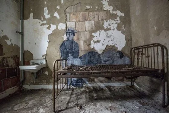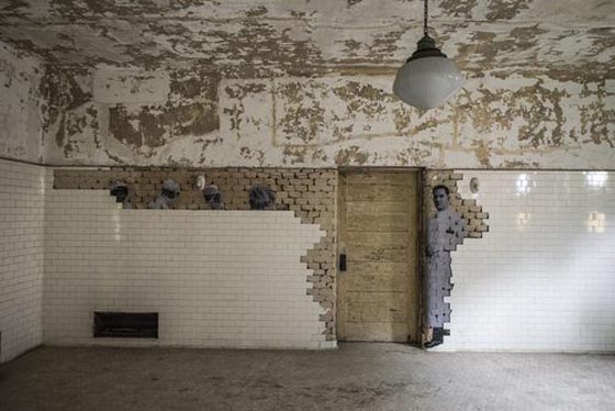 Hospitals are the new creepy locations, given the Ebola scare –and as of this last week, the long-ago abandoned 112 year-old hospital on New York’s Ellis Island has a new photographic installation by French street artist JR. Enlarged vintage photographs were pasted on walls, windows and other corners of the derelict Immigrant Hospital. It’s now open to the public for the first time in 60 years and two-dozen site-specific works pay homage to over 1 million immigrants who spent time at the 750-bed hospital before it was close and fell into disrepair in the 50s.