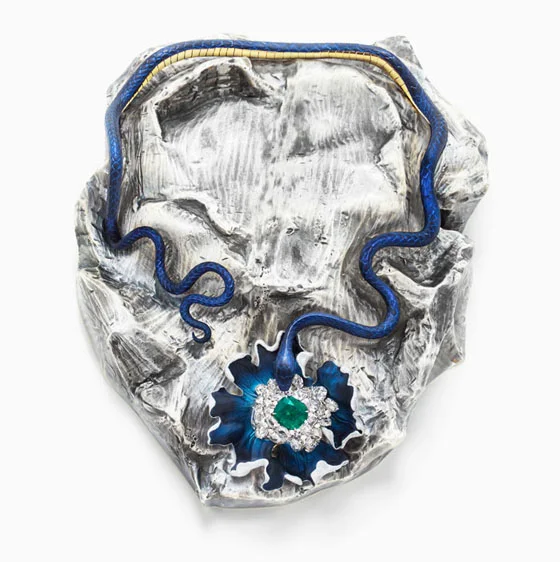 Lunae Lumen Satine Mummy Blue, 2013, Yellow and white gold, platinum, emerald, diamonds, colored lacquer, 2 3/4 x 6 5/16 x 8 11/16″