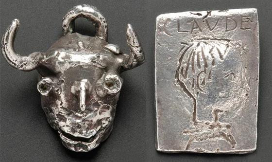 These one-of-a-kind pieces were given to Françoise Gilot, the mother of two of Picasso’s children, Claude and Paloma. Gilot later passed down the pieces to Carole Mallory, the model, actress, and author who was engaged to Claude in the 1960s. In “Life With Picasso,” Gilot describes how Picasso, with the help of Dr. Chatagnier, a dentist, made gold and silver jewelry through the lost wax process. “In all Pablo made about 10 necklaces… I thought they were all very nice except one, a rather heavy head of a satyr, in silver.” As it turned out, that satyr pendant (pictured below, left) fetched the most. $153,000. A round silver “sun” pendant brought in $141,000, while this silver brooch, with a drawing of Claude sold for $92,250.