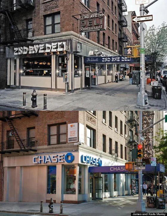 2nd Ave Deli, opened in 1954 in the East Village, replaced by Chase Bank