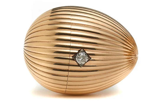 The 3.2-inch Faberge egg has three sapphires suspend golden garlands around it, and a diamond that acts as an opening mechanism.