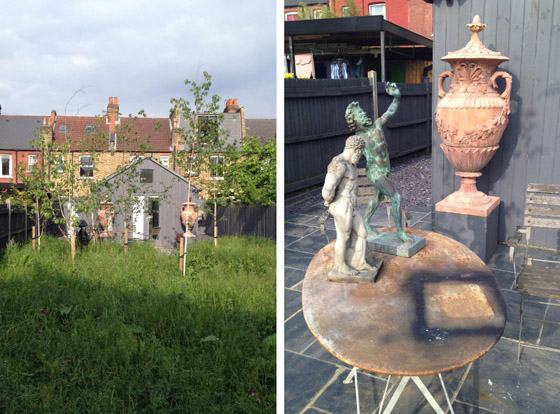 I just visited Miles & Bouke (& their dog, Sonny) in their recently renovated townhouse which is beautifully and stylishly appointed. An installation in their living room, seen here, has all-white Delft domestic pottery rescued in Among them are two small artists’ paint pots with the pigment still in them. For all we know, Vermeer or Rembrandt could have used them. One new addition to their very deep garden was a free-standing, modern studio for Bouke, where he happily commutes 50 meters back and forth each day. He was working on a Goddess Marge statue when I was there, with the rest of the Simpsons to be attached in various locations on her personage. This, when completed he says, might need a whole altar to go-with. I agree.