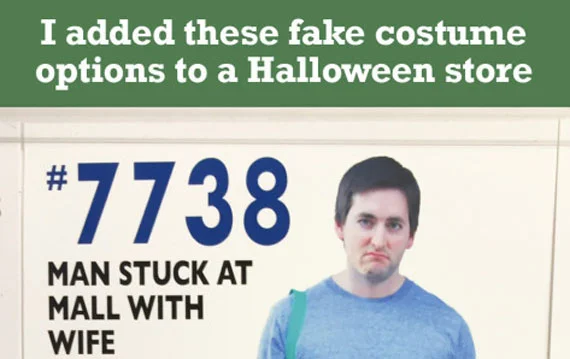 Jeff Wysaski is my new hero. His Tumblr, Obvious Plant, posted these fake pics at a costume store and they are subtly brilliant. Might I suggest wearing the outfit described with a printout of the ad pinned to your chest? Have a look.