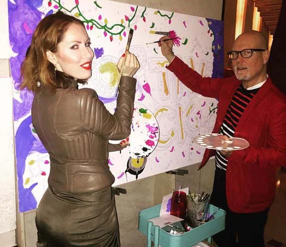Last night, we had a fun holiday coloring party with a giant version for guests to paint. It was great fun. Champagne, food and lots of fun people; writer Christopher Mason, artist Mel Odom, photographer and Downtown diva Maripol, DJ of the moment Valissa Yoe, International Playground‘s Johnny Pizzolato, actors David Ilku & Ryan Landry, promoter Daniel Nardicio, Saks’ Tim Hemmeter, designer Katy K and too many more to list. You always try to invite a good mix of your friends, “influencers” and fun people and that's exactly what I got. One uninvited guest pushed past me, rushed the easel, grabbed a brush and paint and started attacking the painting! Jessica and I looked at each other, like “WTF!?”… I tried to get him to calm down and not go nuts but when he grabbed my friend Cameron‘s wine, slugged it down, I realized this was only going to get worse. So, security came and took him out in a quiet, respectful way. Most of the guests were unaware of what had just happened. Crisis averted, but EXCITING! As friend said later,