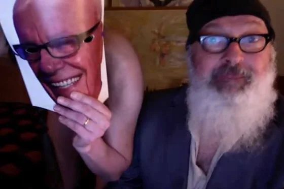 He then hands Evi a Rupert Murdoch mask, and simulates f*cking her yelling, “I’m baaaack!” (his Independence Day catch phrase) as a dog howls. It is WAY too whacked out to be fiction. Watch –if you dare. You might not be the same afterward.