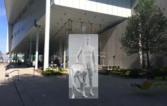The Whitney Museums’s plaza as of this morning, with Charles Ray’s rejected sculpture sculpture “ghosted in”… not sure of the placement, exactly, but you get the idea.