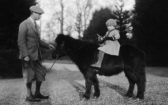 The work was painted from this childhood photograph of the princess taken in 1935, on a horse lead by the reigns by her father King George VI. The painting with a blue horse and the young princess rendered in bright pink, and her father, the King, wearing a bright yellow riding jacket is “Impressionist-inspired”.