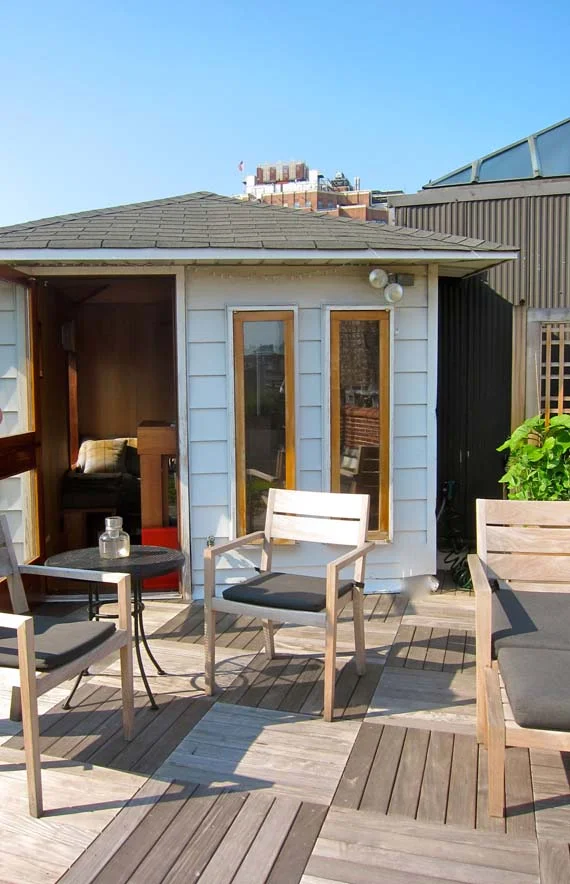 The tiny structure was already on the roof when the Russells bought the space, but it was a standard Home Depot affair surrounded by a tar roof. It has since been transformed, as has the garden just outside the new door and windows.