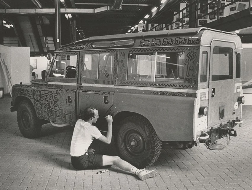 On, Thursday night at the Peterson Automotive Museum in L.A., a rare functional sculpture/ mobile 3D drawing was seen by the public for the first time. One of the late artist Keith Haring‘s lesser-known works is this painted 1971 Land Rover “art car”.