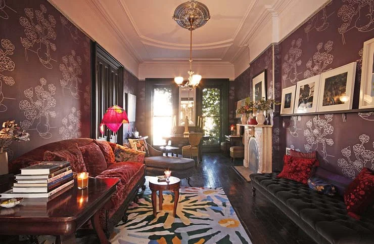 I’ve thrown in the one (above) which is not in the book. It’s my former brownstone in Clinton Hill, now owned by my oldest friend, chef Cary Richardson. It features my paintings and artwork, as well as wallpaper that I designed for this room –and later sold through Anthroplogie Home– along with a rug and pillows featuring my work. It was just the scene of a fun birthday party this spring, when the book just came out. I hope the author doesn’t mind I included it here, I think it fits in nicely, in that it’s a unique Brooklyn interior.