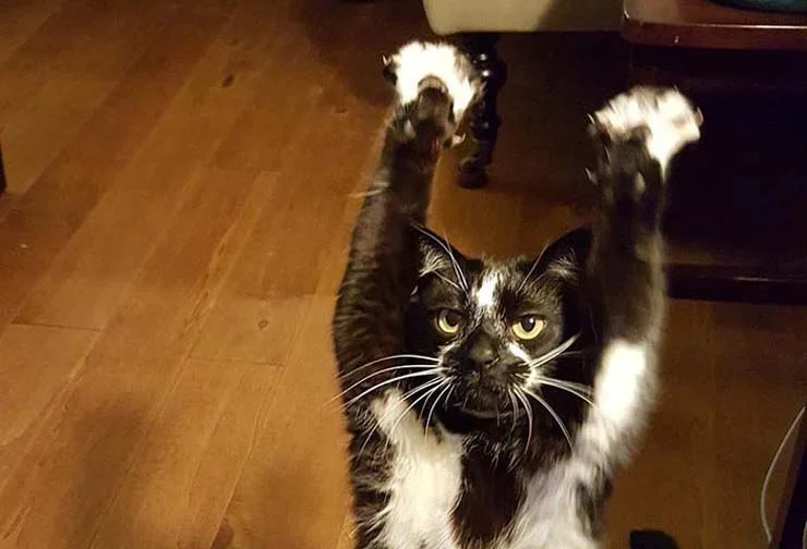 Keys the kitty has an odd habit. Peter Mares, her Californian owner, saw her throw her paws in the air one morning and he took a picture. Then, the next day she did it again –and again. But what is she doing?!
