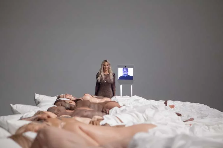 Before Kanye West took the stage at the VMAs on Sunday night, he (remotely) premiered his sculpture, Famous, at the L.A. gallery, Blum & Poe. Not your typical gallery opening it was an exclusive, two-night private viewing of 13 wax celebrities sleeping in a gigantic bed.