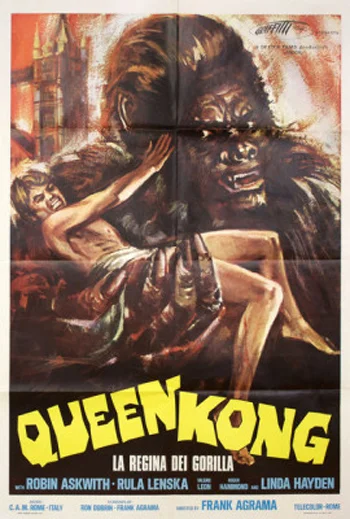 Queen Kong is a 1976 British comedy film spoofing King Kong. It was never released due to legal action by Dino De Laurentiis, the producer of the 1976 King Kong remake and RKO copyright holder of the movie at the time. Although it got a limited release in Italy and Germany, the film has since resurfaced on DVD. Thin as it is, the plot goes like this;