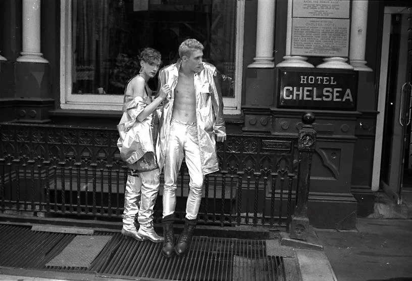 Angie Lieber & Walt in silver leather Stephen Sprouse photographed at The Chelsea Hotel by Craig Barnes NYC 1984