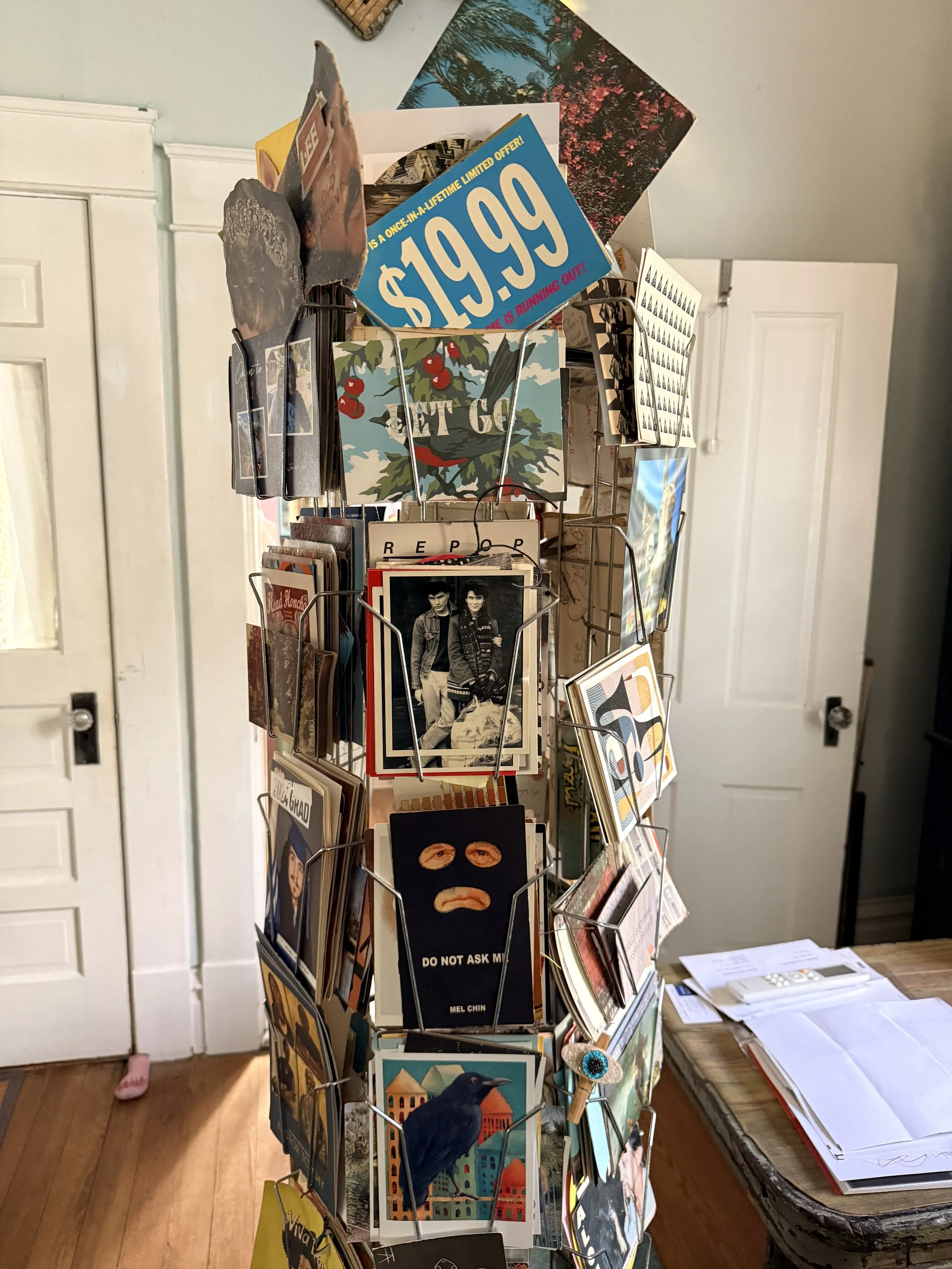 I designed many invitations for Mary’s exhibits (if not all) and often helped her come up with titles, as well. I’m in Mexico at the moment and don’t have access to all my archives, but here’s her last one at Isabella Valise/ Devin Borden, plus her postcard carousel, which contains hundreds of cards, including mine to & for Mary, that span five decades.
